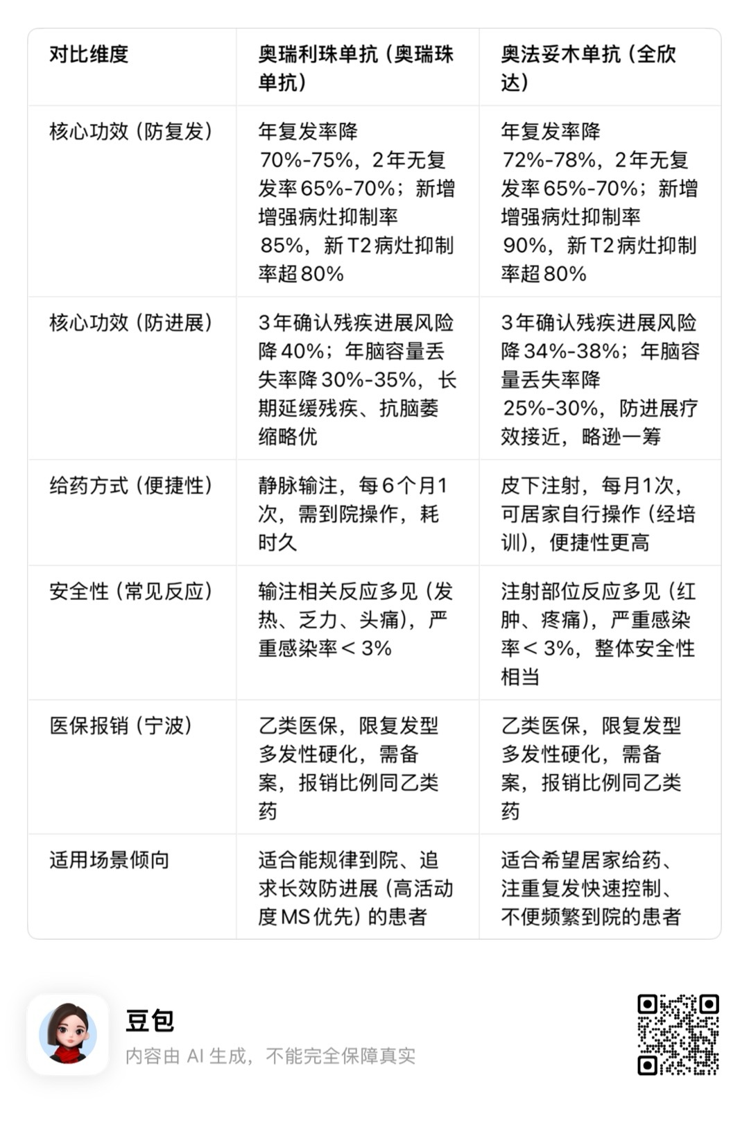 ⚠️ 提示:疗效差异需结合患者个体情况(如疾病活动度、给药偏好、合并症)综合判断,最终方案需由神经科专科医生制定 |